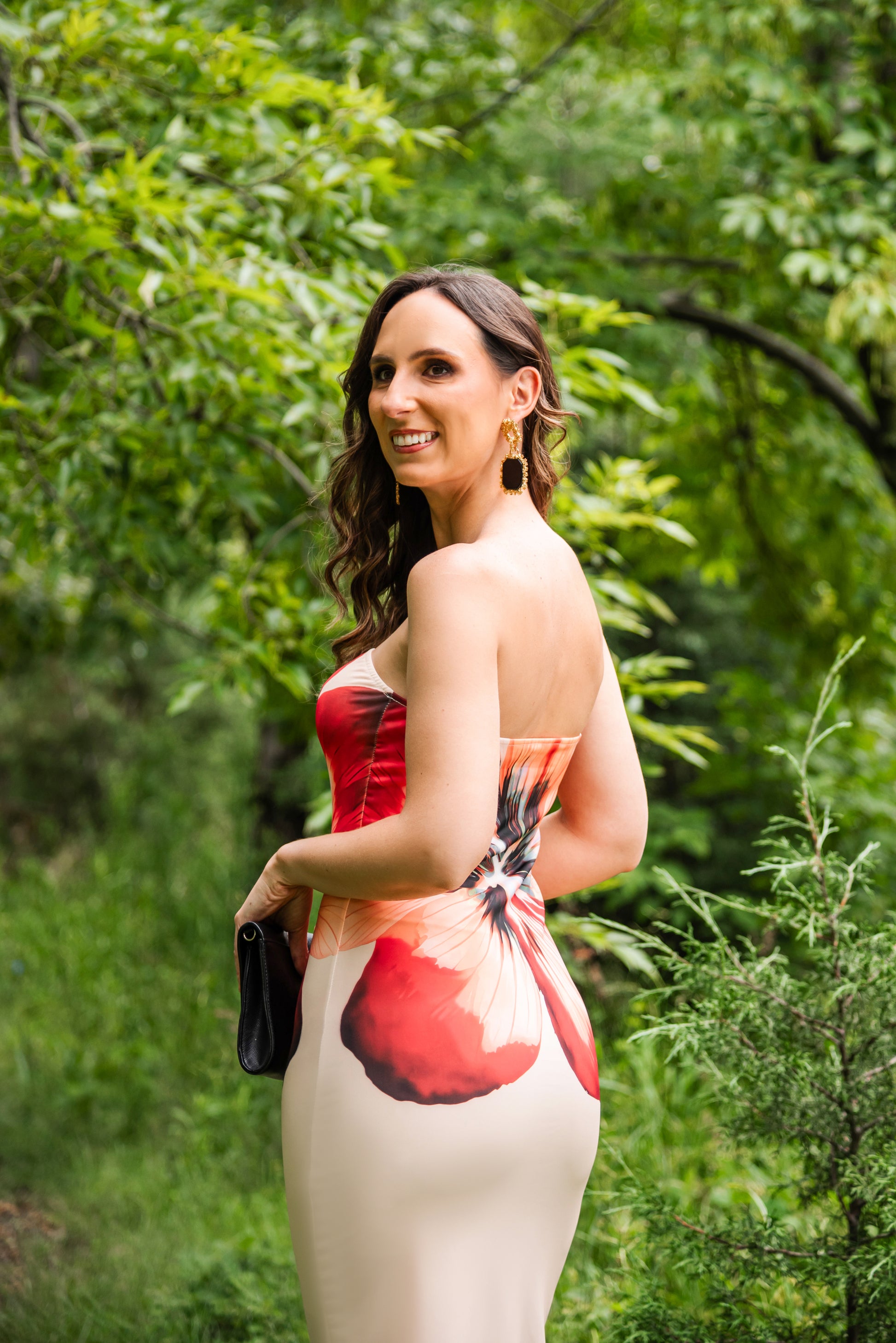 Vestido de licra con estampado de flor, escote palabra de honor.