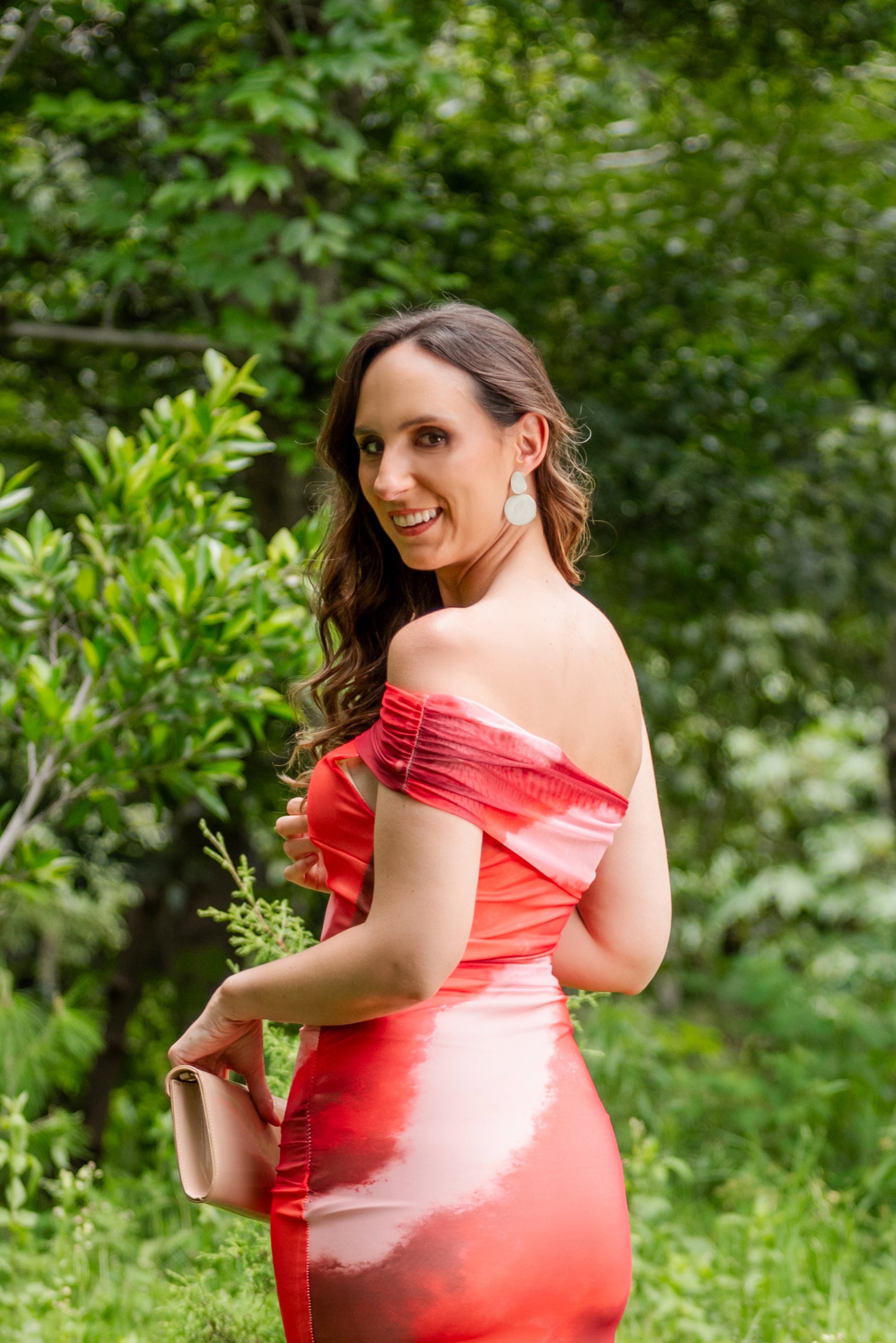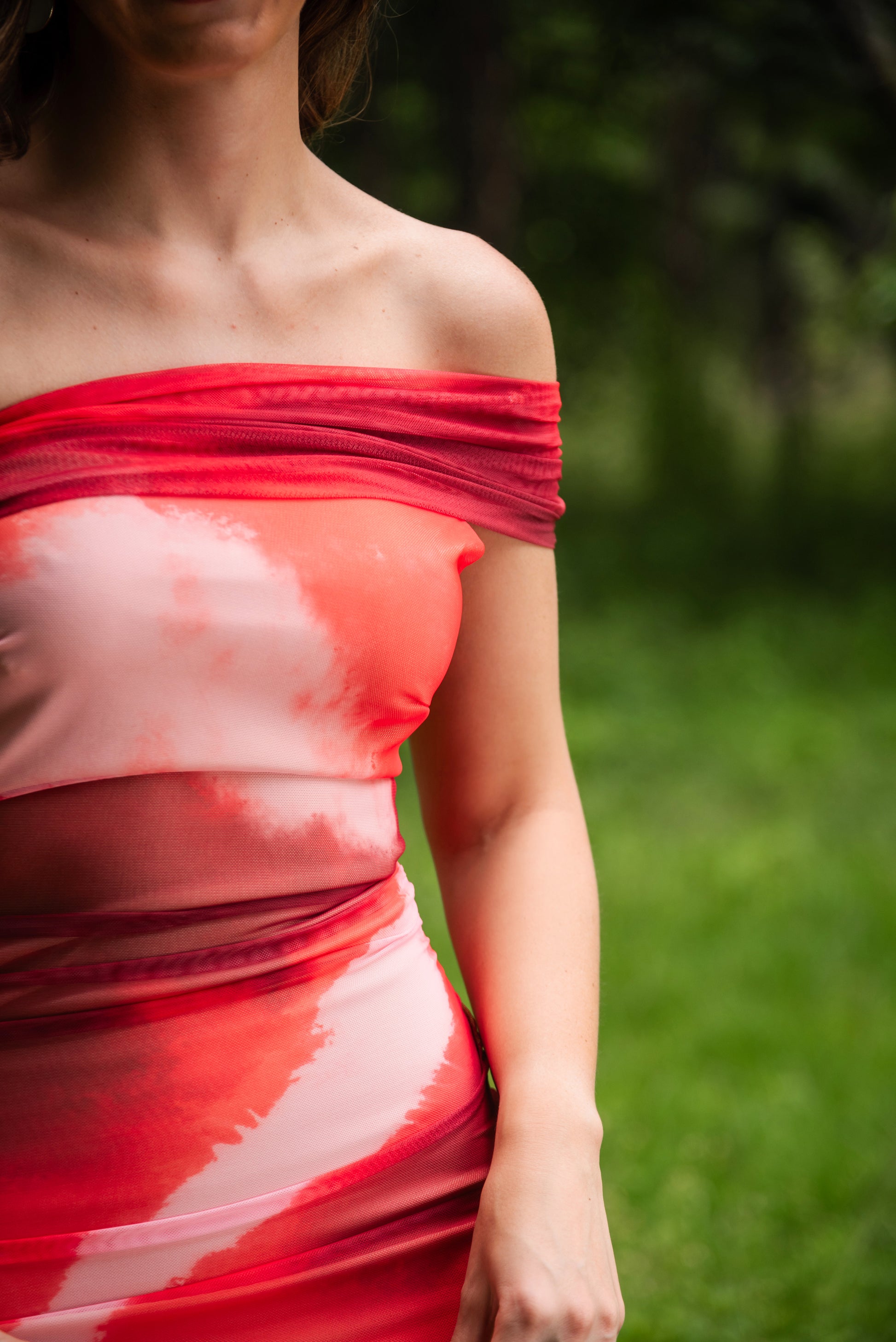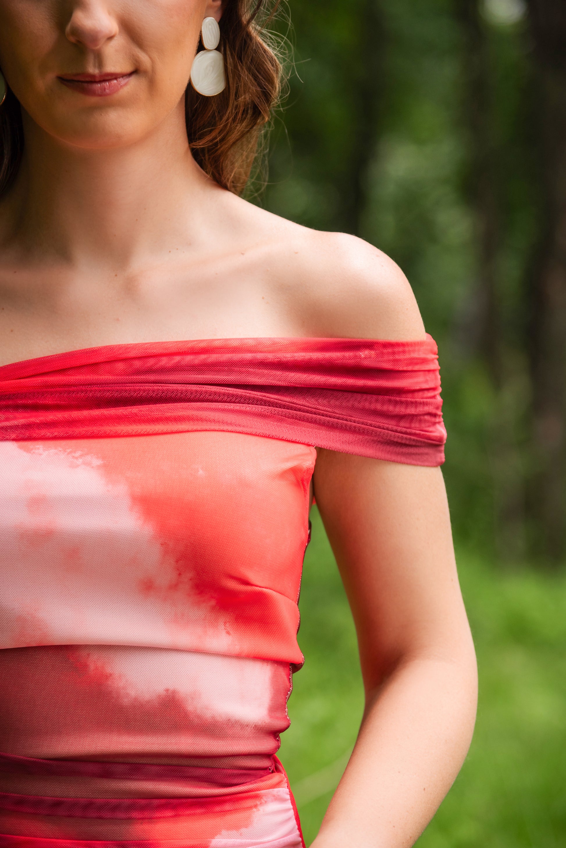 Vestido midi con estampado en tonos rojos, se puede poner con dos mangas off shoulders o con solo una.